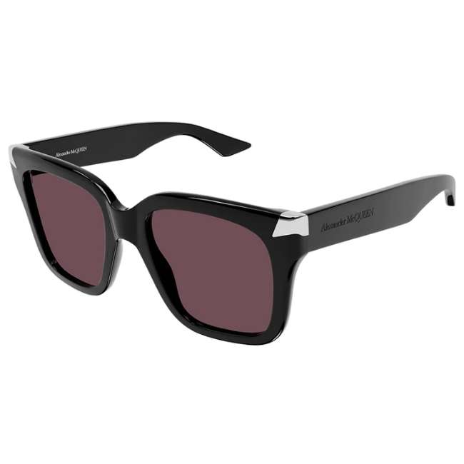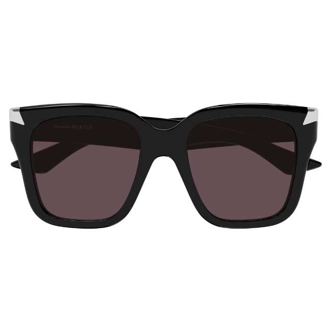 Why the Alexander McQueen AM0440S Stands Out Designers created this colourway for the woman who favours timeless power. The Gloss Black frame offers a stark, high-contrast finish that suits any complexion. However, the defining details are the Silver Metal Rivets on the brow corners. These “spikes” catch the light and signal the brand’s heritage without the need for oversized logos.