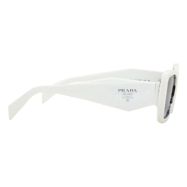 Prada crafts the frame from premium acetate in a striking white finish. This fresh, clean tone offers a bold alternative to traditional dark frames. It immediately brightens the face. The design features a “Butterfly” silhouette. This shape combines the lift of a cat-eye with the structure of a square. This makes it universally flattering for oval, round, and heart-shaped faces.