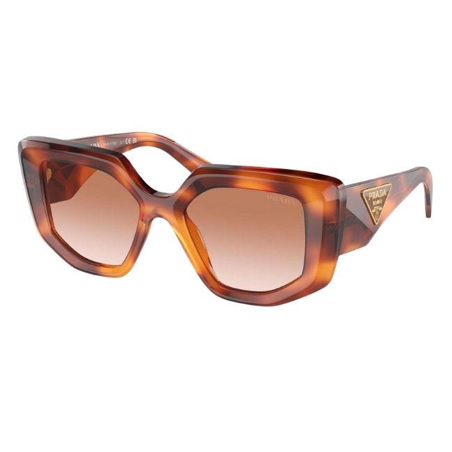 Prada crafts the frame from rich cognac tortoise acetate. This material features deep amber and honey tones that catch the sunlight beautifully. The front utilizes a bold faceted cut. This creates a geometric, multi-dimensional look that plays with volume and shadow. The temples display the brand’s mastery of design. They feature a 3D deconstructed interpretation of the iconic triangle logo.