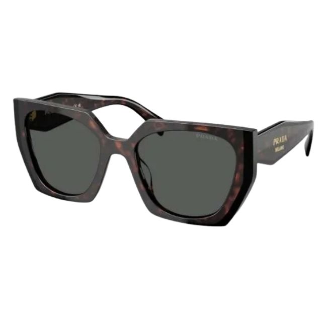 The defining feature involves the three-dimensional “temple-inside-temple” design. These faceted arms create a sharp, geometric profile that catches the light from every angle, immediately identifying the eyewear as a luxury statement. Additionally, the iconic Prada Milano logo appears subtly under the varnish, ensuring it remains pristine over time.
